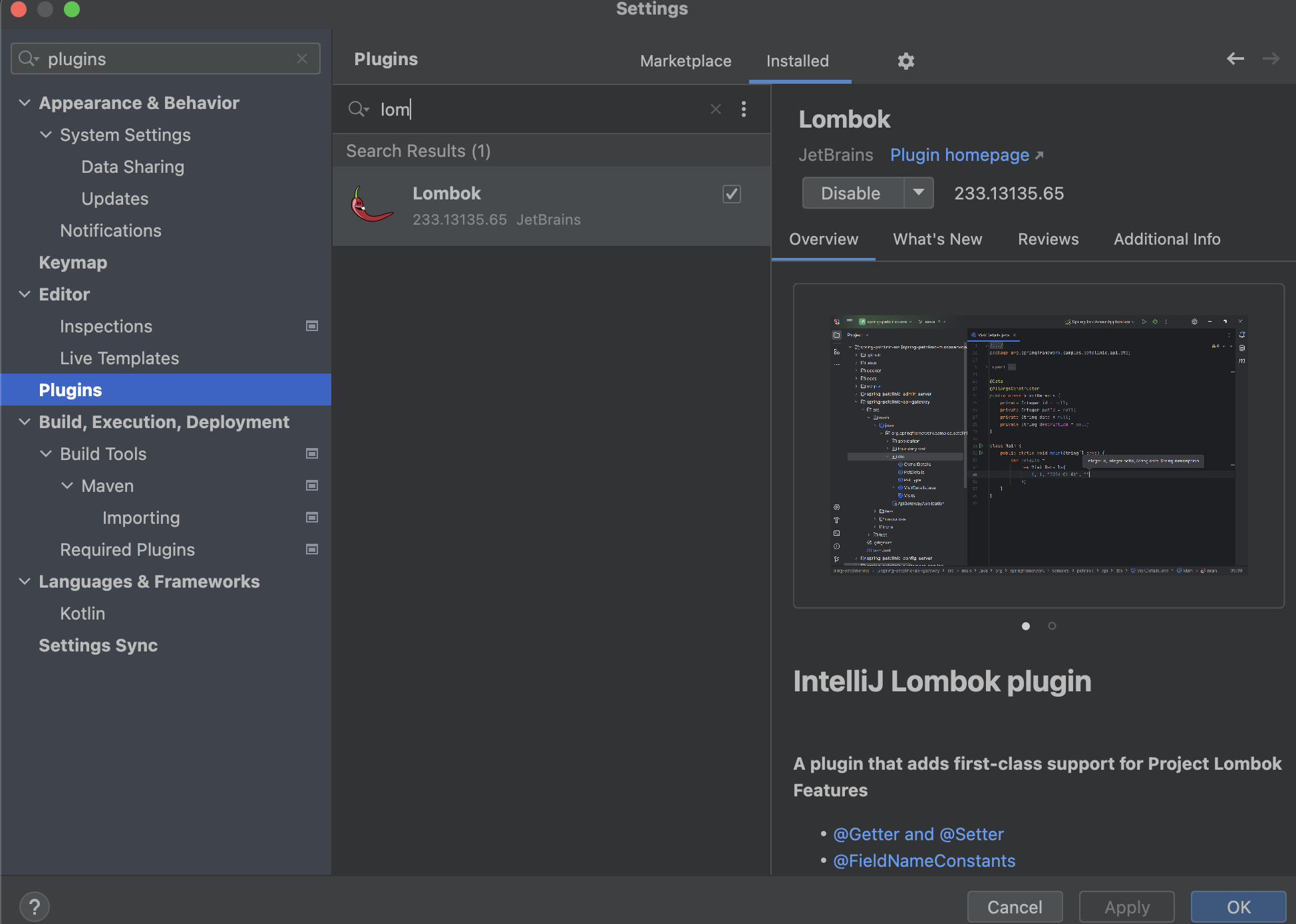 1. (mac 기준) Settings > plugins > lombok 검색 후 설치 후 apply > ok