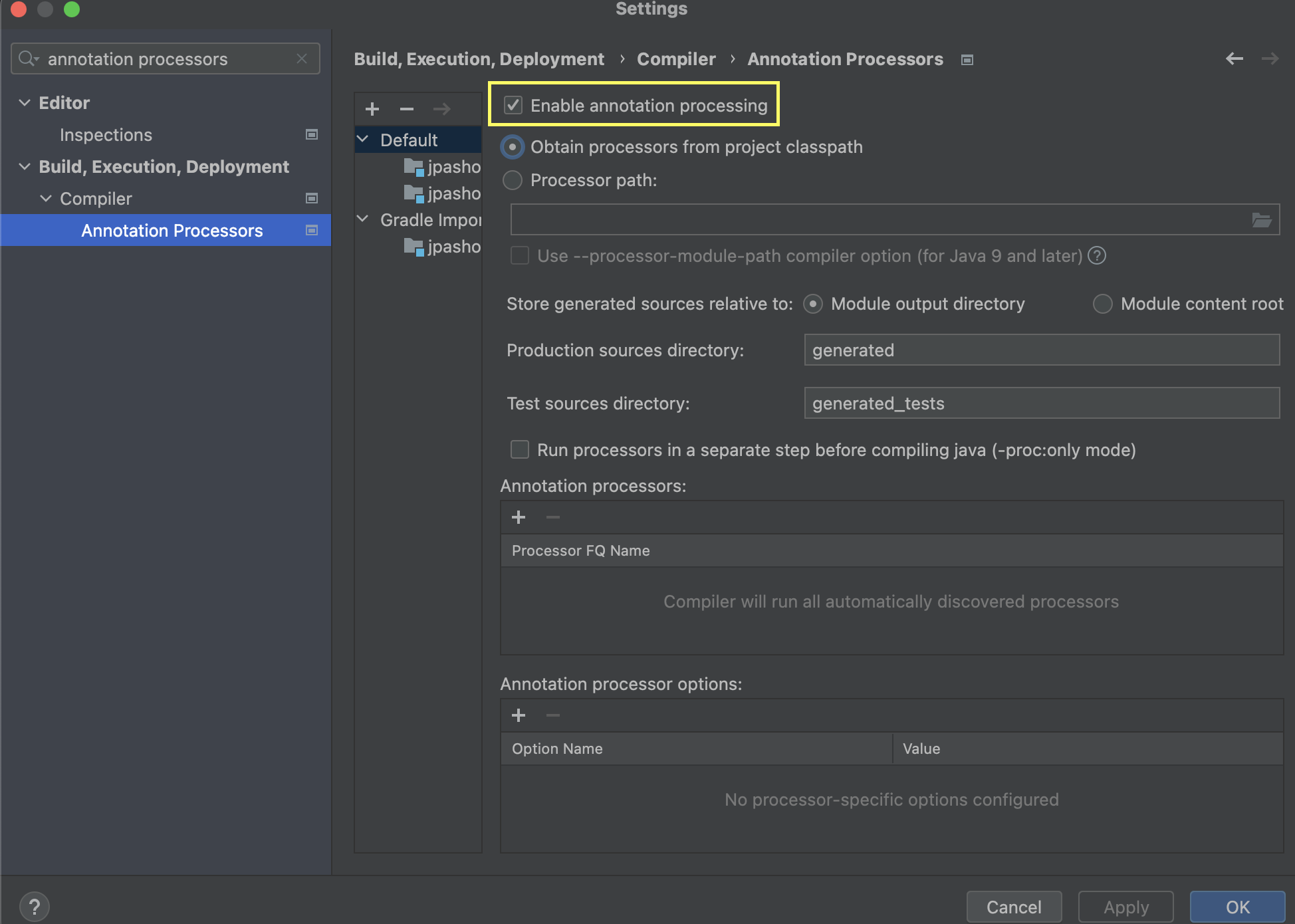 2. Settings > annotation processors > Enable annotation processing 체크 > apply > ok