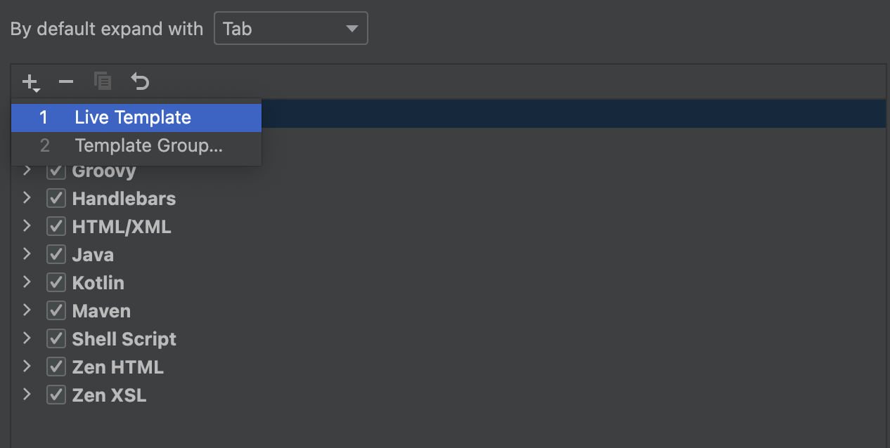 +메뉴에서 Live Template를 클릭하면 아래와 같이 템플릿을 추가할 수 있는 화면이 출력된다.