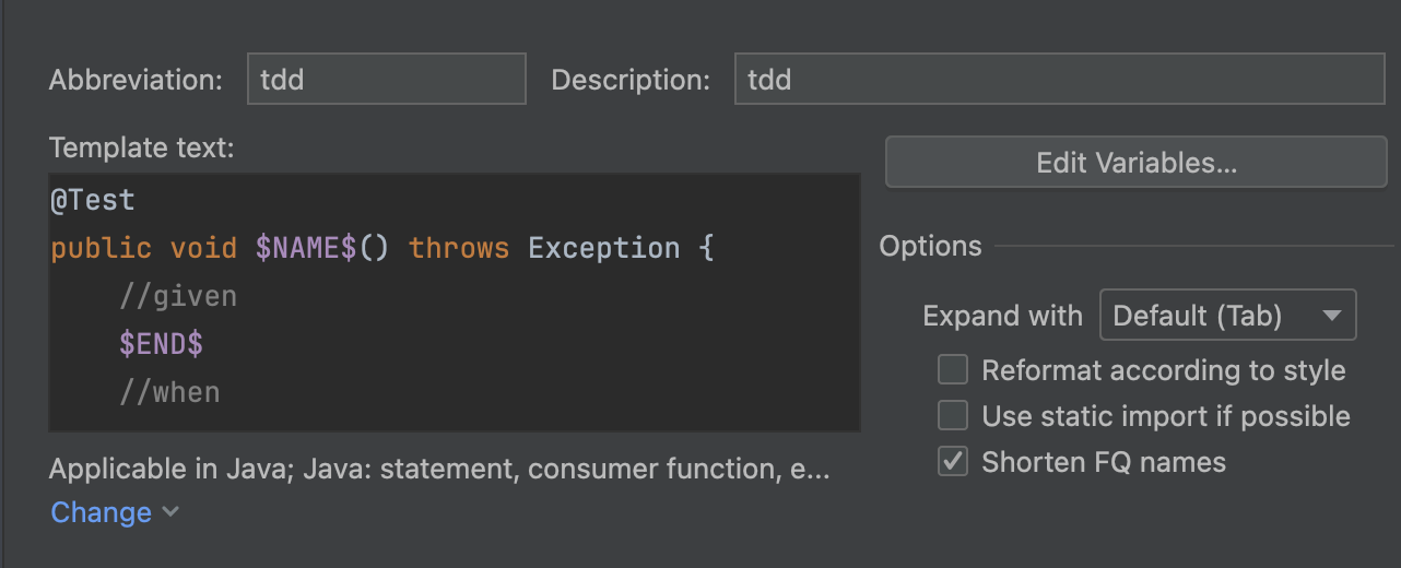 예를 들어 tdd라는 것을 만들고 tab키를 누르면 아래의 템플릿이 자동완성된다.